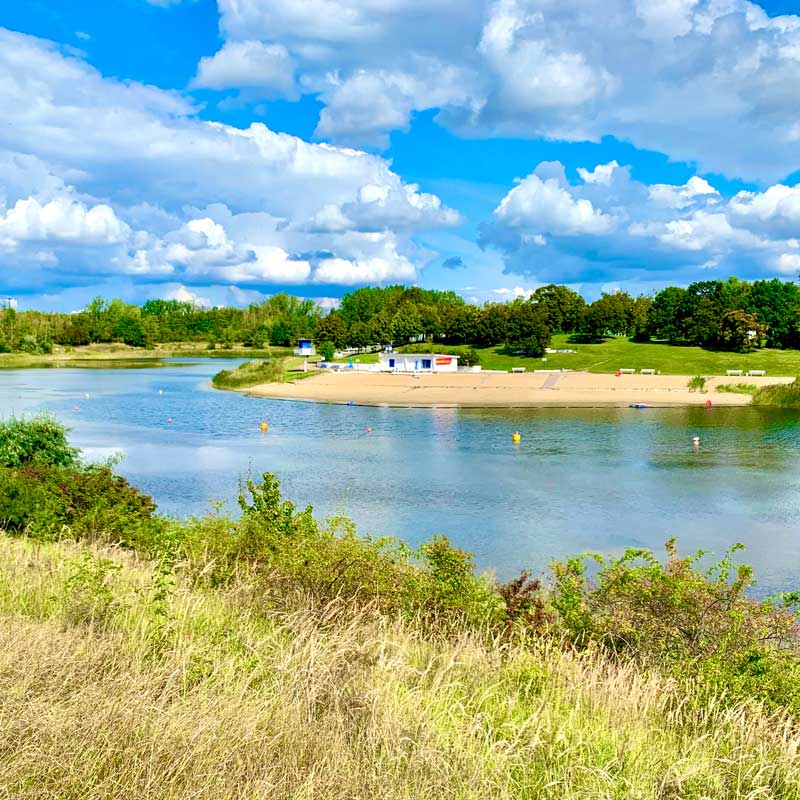 Es entstand in den Restlöchern dreier ehemaliger Tongruben, die bis 1925/1926 betrieben wurden und sich durch ansteigendes Grundwasser und Niederschlagswasser füllten. Der Natursee hat eine Fläche von 5,3 ha, eine mittlere Wassertiefe von 2,50 Metern und eine maximale Wassertiefe von 8 Metern sowie einen Strand von etwa 100 Meter Länge. Er wird als Freibad, Eventlocation und Naherholungsgebiet genutzt. Wie das Friedrichsbad Zwintschöna wird das Naturbad von der Freizeit & Event GmbH betrieben, die es Anfang 2021 in Karlsbad – Angersdorfer Teiche umbenannt hat. Das Wasser ist leicht salzhaltig, was vermutlich auf einen unterirdischen Solezufluss zurückgeführt wird, und der See ist dadurch der einzige Salzsee in der Region.